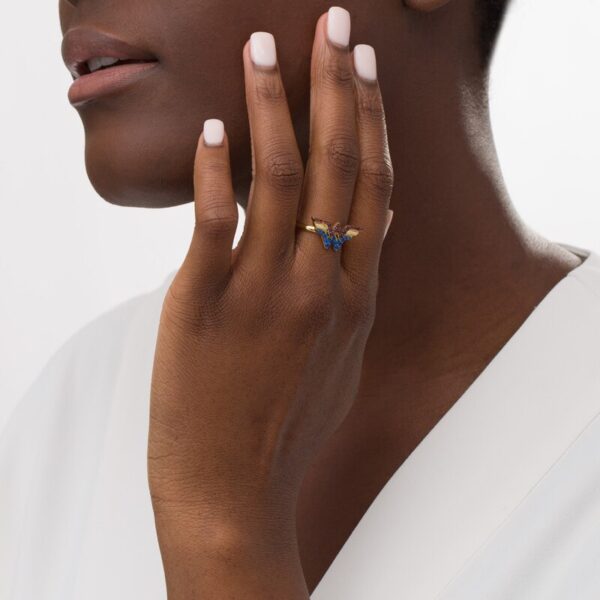 Crafted in warm 10K gold, this striking design features bright blue sapphires and noble garnets. Polished to a brilliant polished sheen, this ring is sure to stand out.